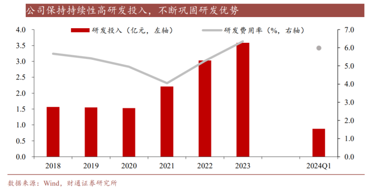 2023年公司研发费用3.59亿元,同比+18.48%,研发费用率6.35%,同比+1.07pct;
