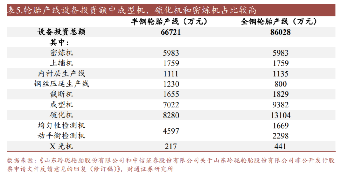 轮胎加工制造包含多道工序,产线设备需求量较大。旺盛的扩产需求带来大量新增设备需求。目前国内主要轮胎企业海外拟建产能超过5000万条。以玲珑轮胎“长春年产120万条全钢子午线轮胎和300万条半钢子午线轮胎生产项目”为例,新增全钢子午线轮胎产线的设备投资总额为8.60亿元,新增半钢子午线轮胎产线的设备投资总额为6.67亿元。以此为基础估算,仅国内主要上市轮胎企业的拟建产能将带来百亿级别的设备需求。