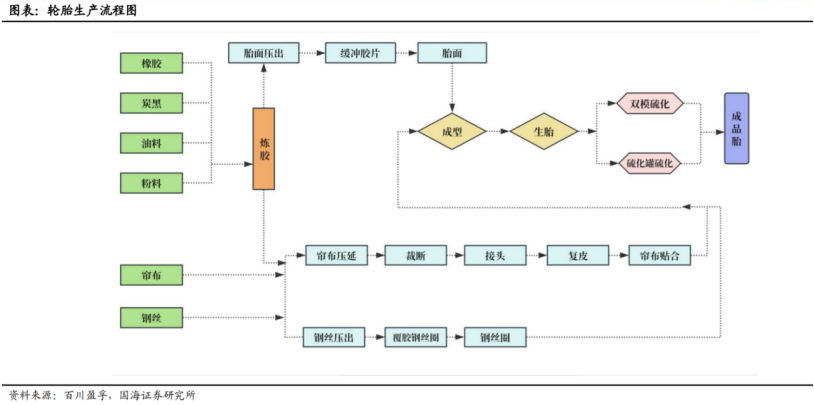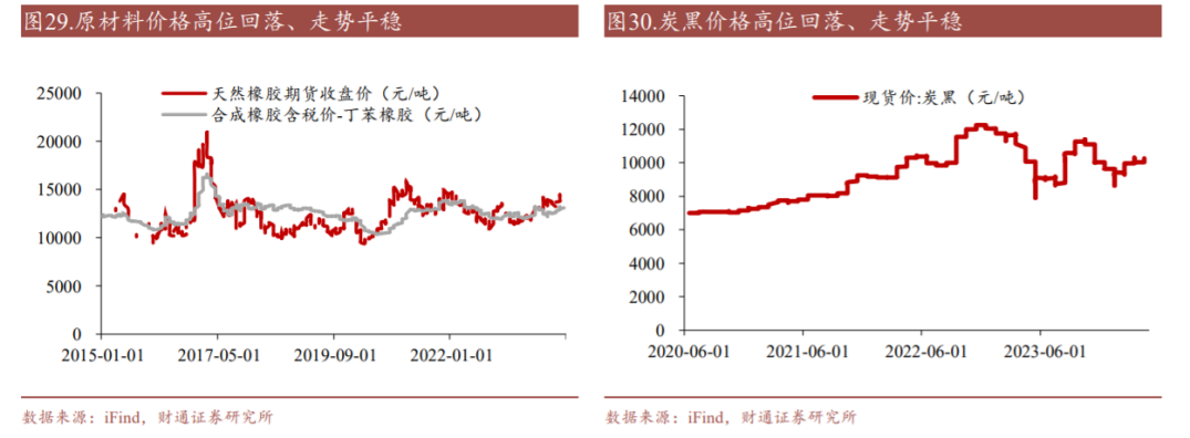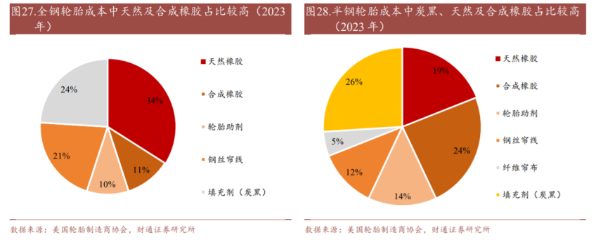 影响轮胎生产成本的重要原材料为天然橡胶、合成橡胶及炭黑。天然橡胶与合成橡胶合计分别占半钢胎和全钢胎原料成本的43.0%和45.0%。其次是填充料,主要包括炭黑、白炭黑等,分别占半钢胎和全钢胎原料成本的26.0%和24.0%。钢丝帘线是成本占比第三的原料,在全钢胎中的使用占比更高,分别占半钢胎和全钢胎原料成本的12.0%和21.0%。