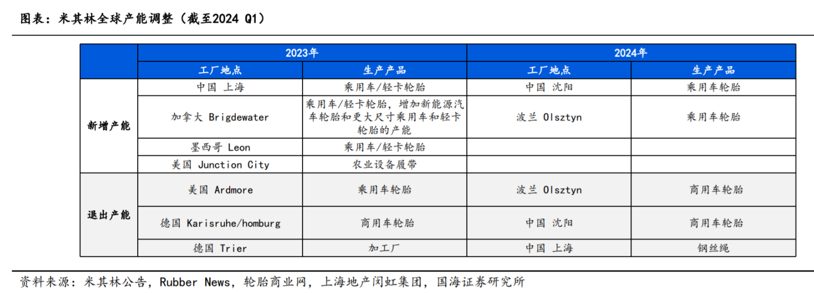 据米其林2024Q1财报资料,米其林全球产能处于调整期,调整完成后,其全球范围内低于18英寸的乘用车产能和卡客车轮胎产能分别将分别减少约7%和15%。