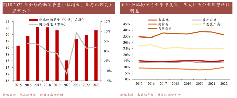 2023年全球轮胎消费量小幅增长,库存已恢复至正常水平。米其林预计未来两种需求将紧密保持一致。世界轮胎行业经过多年发展已经进入成熟阶段,行业集中度高,三大巨头企业优势地位明显,销售额常年占据行业前三。。2022年米其林、普利司通、固特异的全球市场份额分别为15.1%、14.2%、9.6%,同比提升0.5pct、0.6pct、1.4pct,而CR10达到了68%,行业集中度进一步提升。