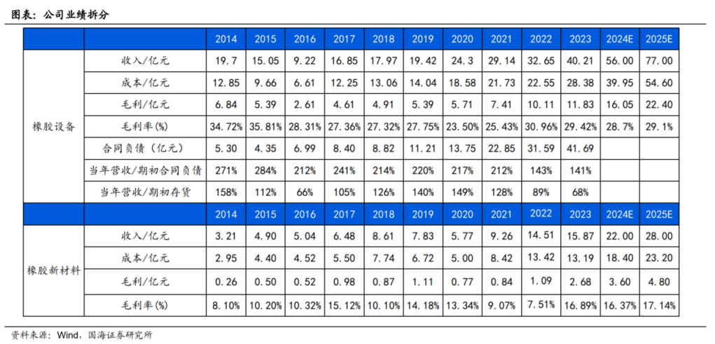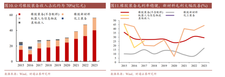 橡胶装备为公司核心主业,收入占比约为70%。分产品来看,2023年公司主营业务中,橡胶装备收入为40.21亿元,同比增长23.13%,占营业收入的71.20%;橡胶新材料收入为15.87亿元,同比增长9.39%,占营业收入的28.10%。橡胶装备业务毛利率总体保持相对平稳,橡胶新材料业务毛利率呈快速提升趋势,2023年为16.89%,同比提升9.38pct。