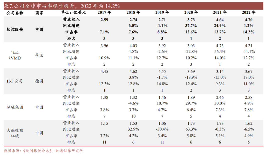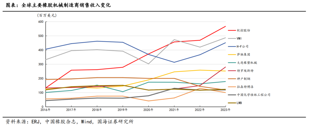 公司全球市占率稳步提升,2022年为14.2%。橡胶机械订单明显向行业头部企业集中,行业集中度提高,向智能化、数字化程度高的企业倾斜,呈现强者愈强的现象。近年来,公司全球市占率逐年提升,2022年以4.7亿美元的销售收入再次位列首席,全球市占率达到14.2%,同比提升0.5pct。随着公司产品实力、服务质量和品牌认可度的提高,全球市占率仍有望延续提升趋势。