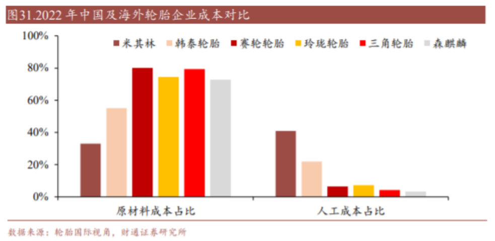 从轮胎企业目前成本构成对比来看,国产轮胎企业的原材料占比要相对高于外资轮胎企业,但人工成本较低。2022年,米其林的营业构成中,人工成本的占比最高,达到41%;其次为原材料成本,占比33%。同期,韩泰轮胎的原材料成本约占营业成本的55%,人工成本约占营业成本22%。与之相比,2022年,赛轮轮胎、玲珑轮胎、三角轮胎以及森麒麟的单条轮胎成本为378、221、349、227元,其中原材料成本占比分别约为80.04%、74.4%、79.39%和72.77%,人工成本占比分别为6.53%、7.21%、4.26%和3.37%。