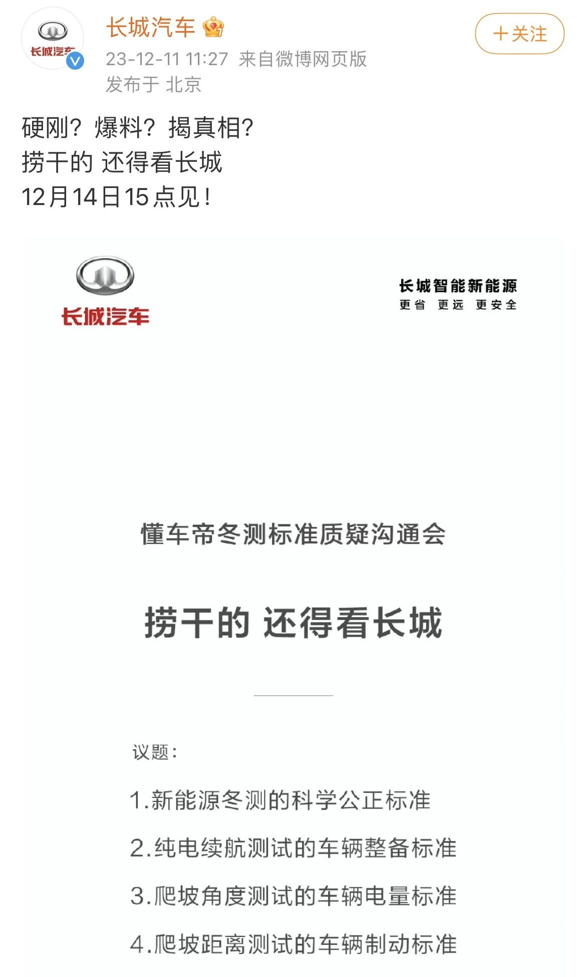 12月11日,长城汽车官博宣布,将于12月14日15时在北京举行懂车帝冬测标准质疑沟通会。当日,吉利控股集团高级副总裁@杨学良Victor发文直言,不认同懂车帝发布的《2023懂车帝冬测》混动车型纯电续航达成率的测评结果。