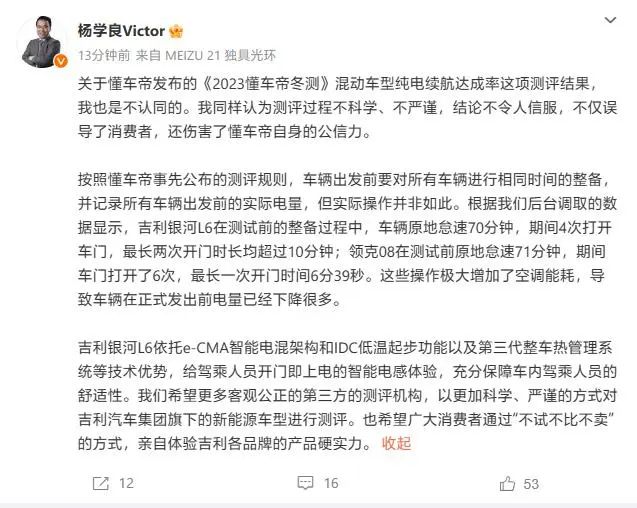“我同样认为测评过程不科学、不严谨,结论不令人信服,不仅误导了消费者,还伤害了懂车帝自身的公信力。”吉利控股集团高级副总裁杨学良说。
