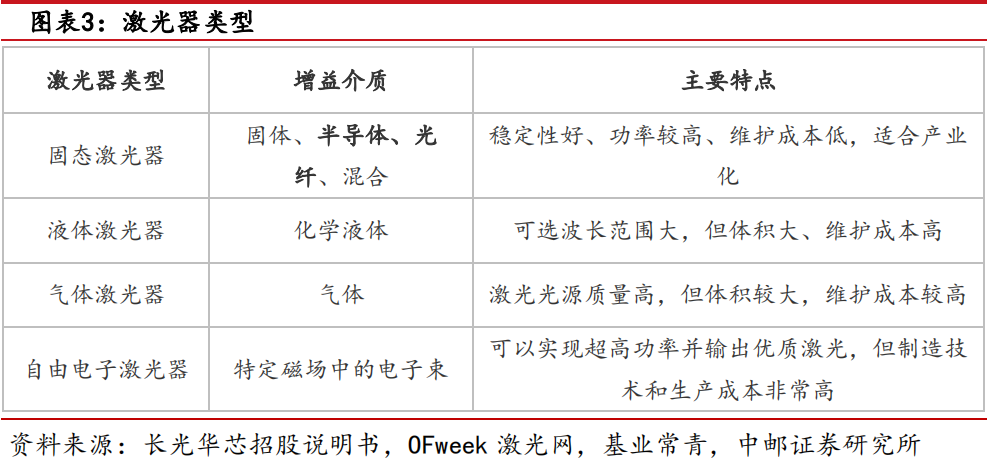 中游是利用上游激光芯片及光电器件、模组、光学元件等作为泵浦源进行各类激光器的制造与销售,包含光纤激光器及半导体激光器等。代表企业包括国外企业IPG、SPI以及国内企业创鑫激光及锐科激光等。