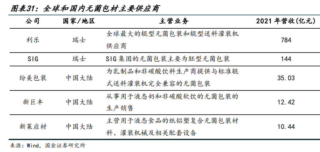近年来我国的无菌包装材料行业取得了较大进步,中国本土无菌包装材料生产商从材料、技术到生产工艺等方面都努力取得了突破,在与国际巨头的竞争中拥有性价比和本土化的优势。随着市场竞争力的不断提升,本土无菌包装材料的市占率稳步提升,食品结构的优化升级对相关设备材料的洁净度提出更高要求,为高洁净应用材料提供更广阔的市场空间。