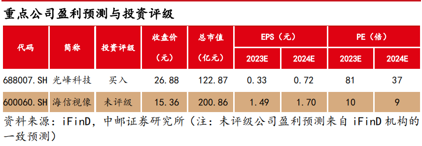 上市公司投资机会方面,光峰科技是拥有原创技术、核心专利、核心器件研发制造能力的全球领先激光显示科技企业,ALPD激光显示全球之冠,在全球激光电影放映领域占有领导者地位。22年半年报披露,已在超小型便携激光机、车规级激光机、宽色域高动态范围光机等领域取得突破,开始进行市场化推广。