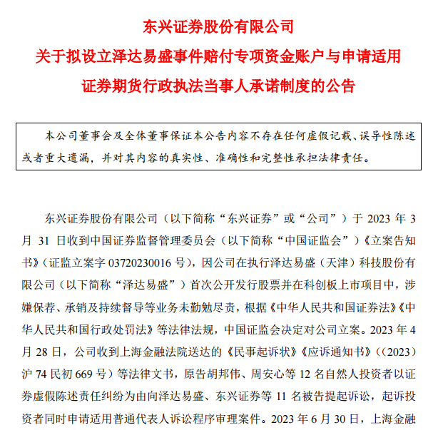 东兴证券9月21日发布公告,公司拟与其他中介机构及相关当事方拟共同出资3.4亿元设立泽达易盛事件赔付专项资金账户,通过司法调解等高效方式赔付适格投资者的投资损失,并向证监会申请适用证券期货行政执法当事人承诺制度。