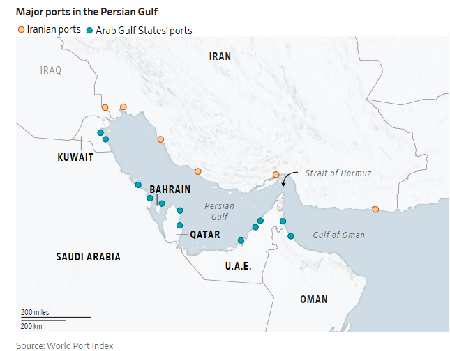 注:图中蓝色为阿拉伯国家港口 橙色为伊朗港口