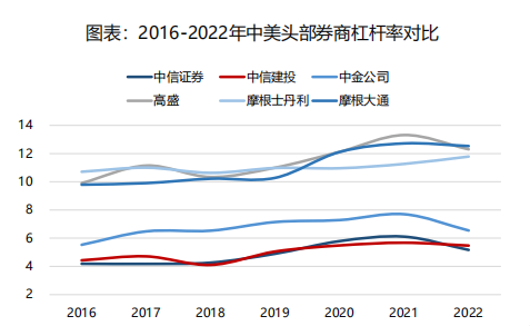 头部券商杠杆率仍具备较大提升空间。2022年,中信证券/中信建投/中金公司杠杆率分别为5.17/5.49/6.54倍,较之国际头部投行仍有较大提升空间(2022年高盛/摩根士丹利/摩根大通杠杆率分别为12.30/11.79/12.54倍)。