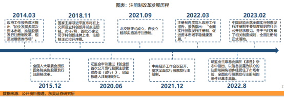 注册制改革于2014年首次写入政府工作报告,并在2015年快速推进,后因股市异常波动而暂缓。2018年后,注册制改革逐步重启,科创板、创业板、北交所试点注册制先后落地。推行全面注册制的条件渐渐具备,2023年2月,证监会发布全面实行股票发行注册制相关制度规则,完成了发行制度改革的最后一跃。