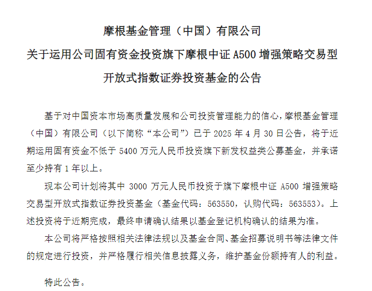 4月以来,公募基金纷纷出手自购,以“真金白银”做多A股。4月30日,摩根基金发布公告称,基于对中国资本市场高质量发展和公司投资管理能力的信心,公司将于近期运用固有资金不低于5400万元人民币投资旗下新发权益类公募基金,并承诺至少持有1年。公司计划将其中3000万元人民币投资于旗下摩根中证A500增强策略交易型开放式指数证券投资基金,该项投资将于近期完成。