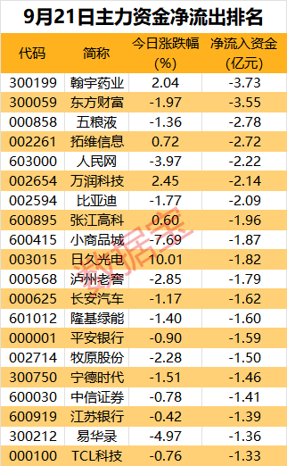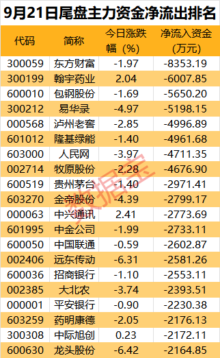数据宝统计,4股尾盘净流出资金超5000万元;其中东方财富净流出超8000万元,排在首位,股价今日下跌1.97%,再度跌破15元/股整数关口。