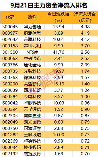 华力创通主力资金净流入4.98亿元,位居首位,今日上涨13.94%。消息面上,市场传华为新机卫星通信芯片为双备份,华力创通供应占比30%。