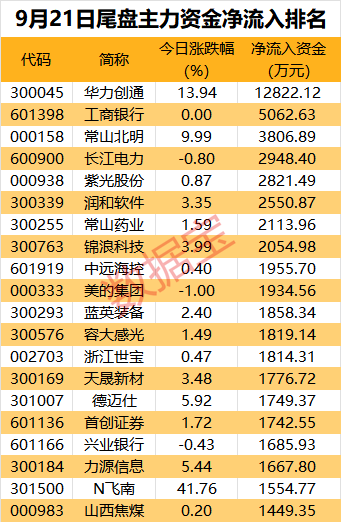 个股方面,华力创通是唯一尾盘资金净流入超亿元的个股,金额为1.28亿元。其后,工商银行净流入资金为5000万元。