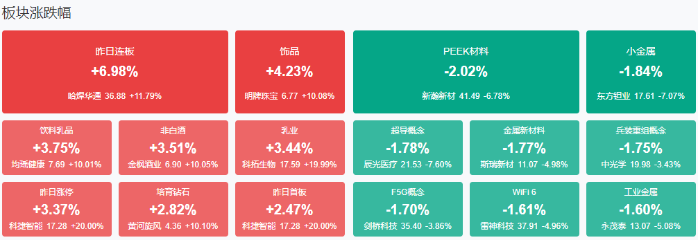 板块方面,饮料制造、化纤、IP经济、中药等板块涨幅居前,PEEK材料、CPO、核电、苹果概念等板块跌幅居前。截至收盘,沪指跌0.33%,深成指跌0.87%,创业板指跌0.98%。