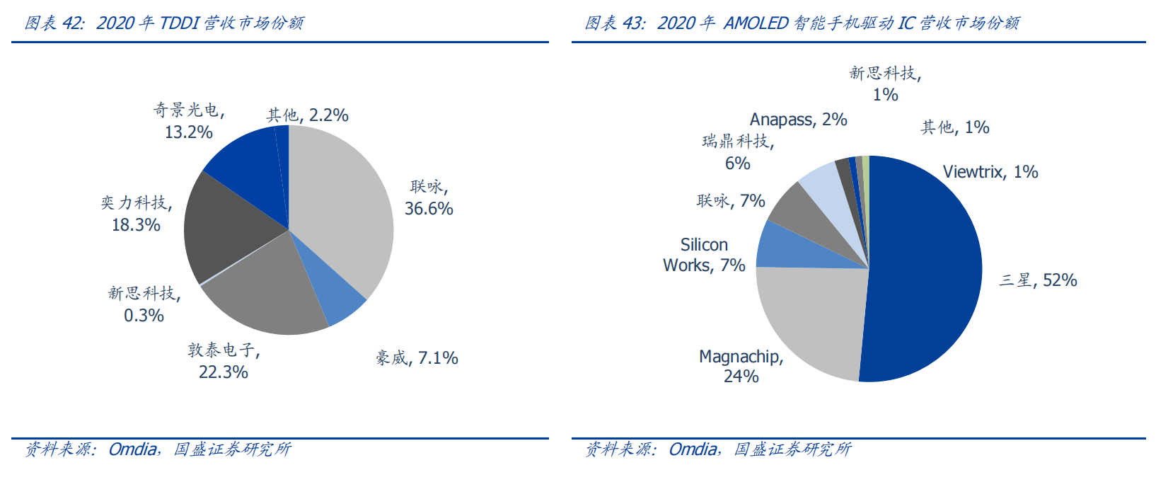 国盛证券研报指出,行业格局来看,TDDI市场主要由中国台湾厂商主导,豪威2020年全球市占率达到7.1%。而AMOLEDDDIC方面,三星和Magnachip两家韩国厂商2020年占据76%的市场。随着国内面板厂商OLED领域投入不断加大,产能迅速提升,未来中国大陆也有望成为OLED驱动IC重要需求市场。
