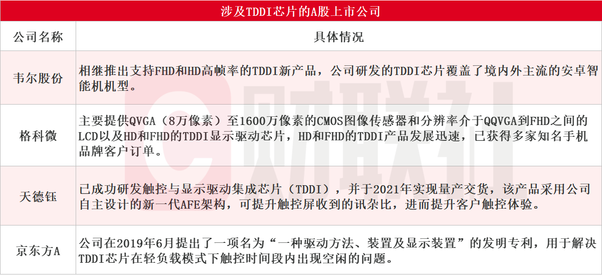 据财联社不完全统计,目前涉及TDDI芯片的A股上市公司主要有韦尔股份、格科微、天德钰、京东方A等,具体情况如下:
