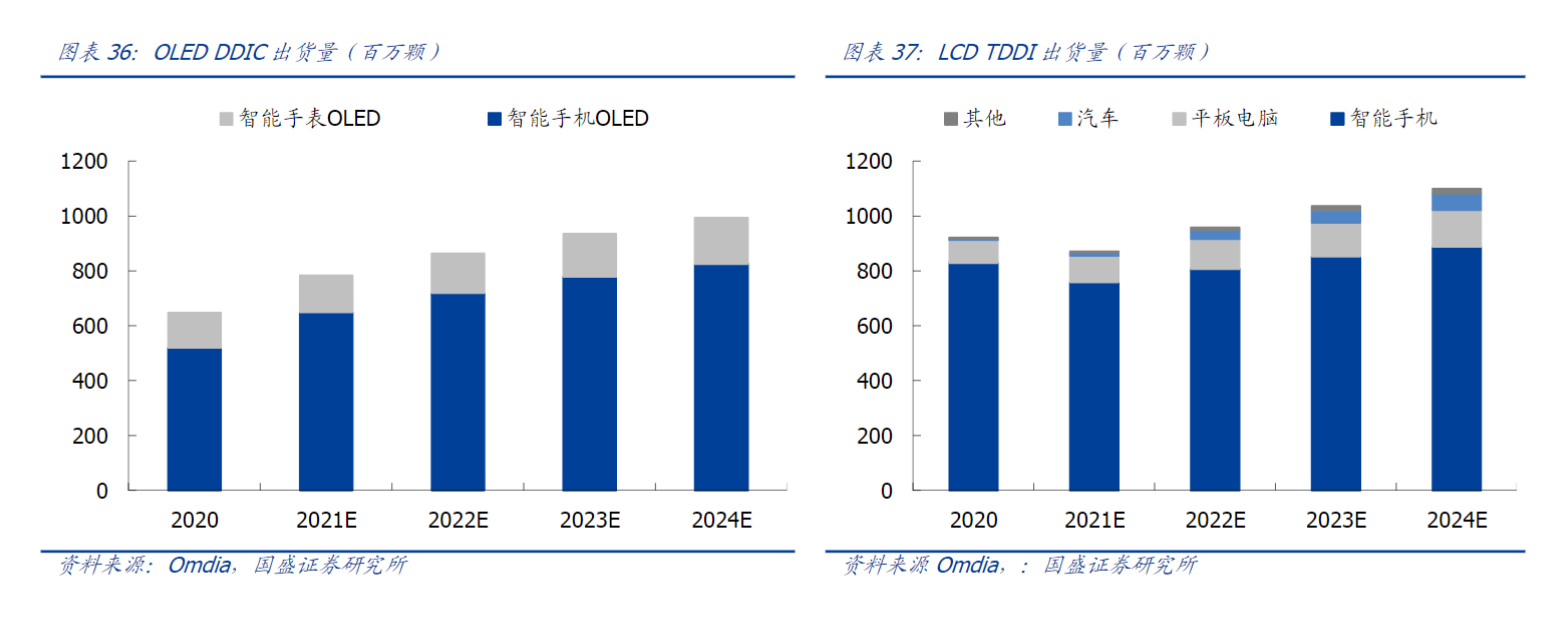 国盛证券指出,智能手机是LCD驱动IC中TDDI出货的最大组成部分。若考虑增速,汽车领域TDDI应用增速最快,2021-2024年出货量CAGR达到76%。