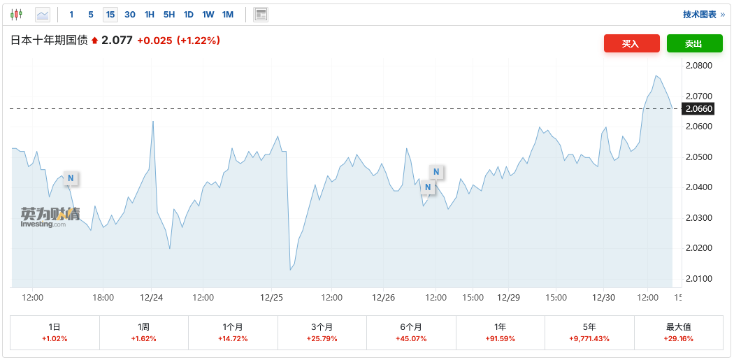 由于对日本政府财政状况的担忧,基准十年期日本国债收益率周二上升逾2个基点,至2.077%,距离12月22日触及的2.1%水平不远,该水平是自1999年2月以来的最高水平。数据显示,该收益率在2025年已累计飙升近1个百分点,创下自1994年以来的最大年度涨幅。