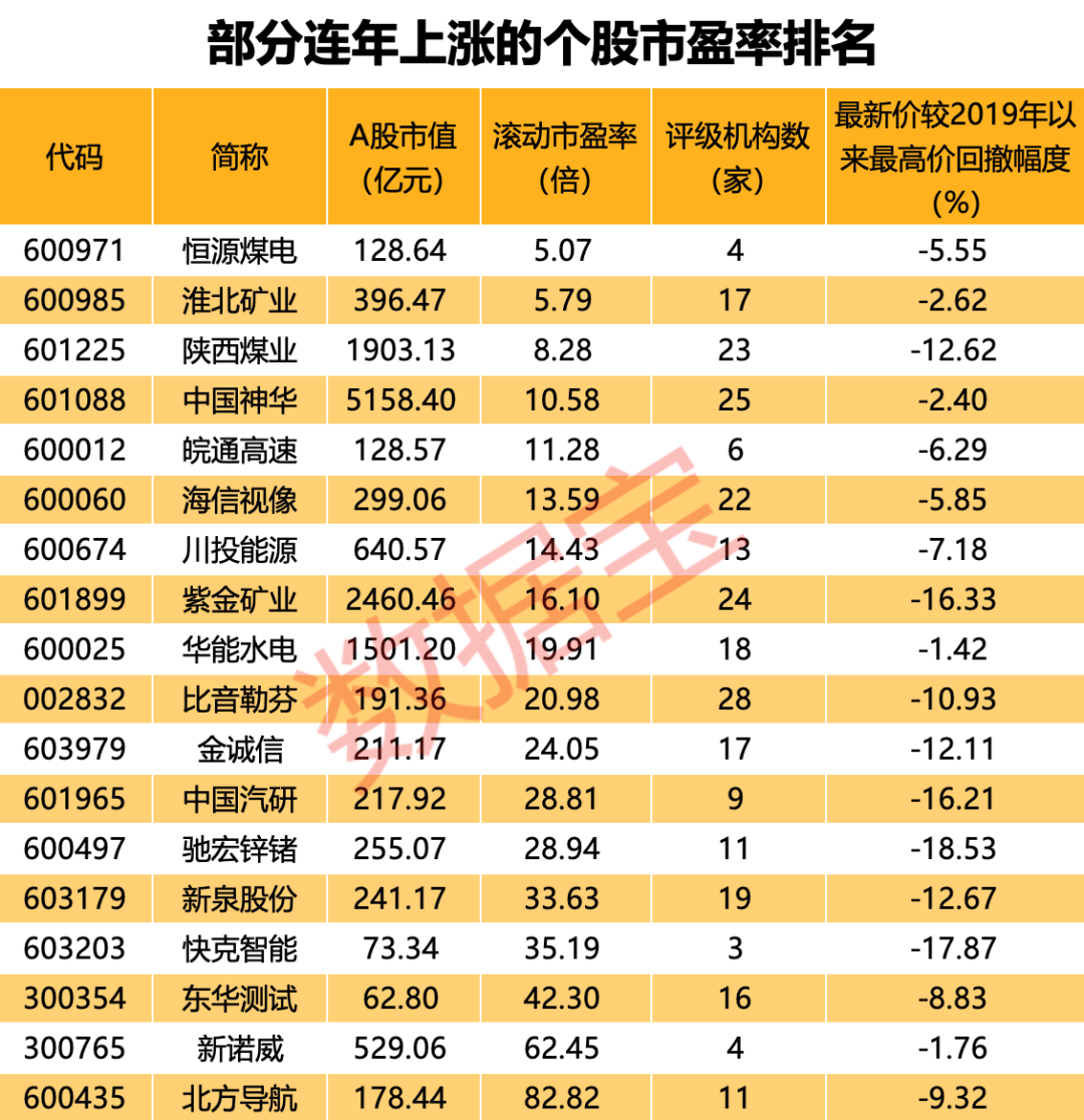 数据宝统计,连续5年股价上涨且最新价较2019年以来最高价回撤不足20%的个股中,只有18只个股获得3家及以上机构评级;中国神华、紫金矿业、陕西煤业、华能水电等千亿市值股票均位列其中。