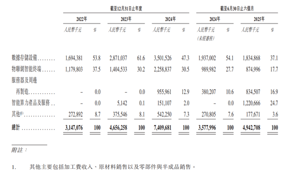 从业务结构来看,协创数据在2022年至2025年上半年(截至6月30日),公司业务结构呈现出明显变化。此前,数据存储设备是核心支柱,2022-2024年收入从16.94亿元增至35.02亿元(人民币,单位下同),2025年上半年虽占比降至37.1%,但依然以18.35亿元的收入领跑,是公司规模最大的业务。物联网智能终端作为曾经的第二大业务,2022-2024年收入从11.80亿元增至22.59亿元,占比稳定在30%左右,但在2025上半年,该业务的收入有所下滑,占比也降至17.7%,收入规模被智能算力业务反超。