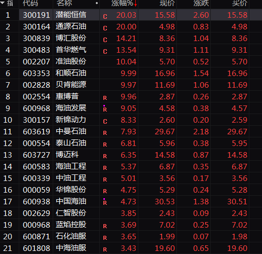 通源石油、潜能恒信20%涨停,准油股份、和顺石油等涨停或涨超10%。