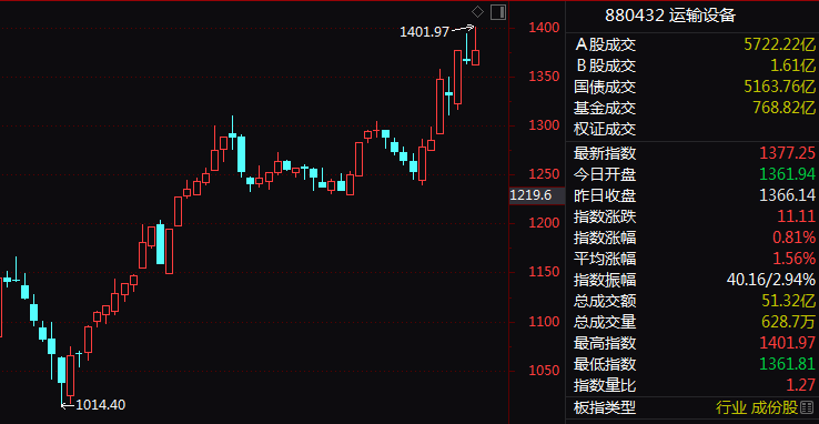 运输设备板块盘初一度放量直线拉升涨近3%,创3年多来新高。