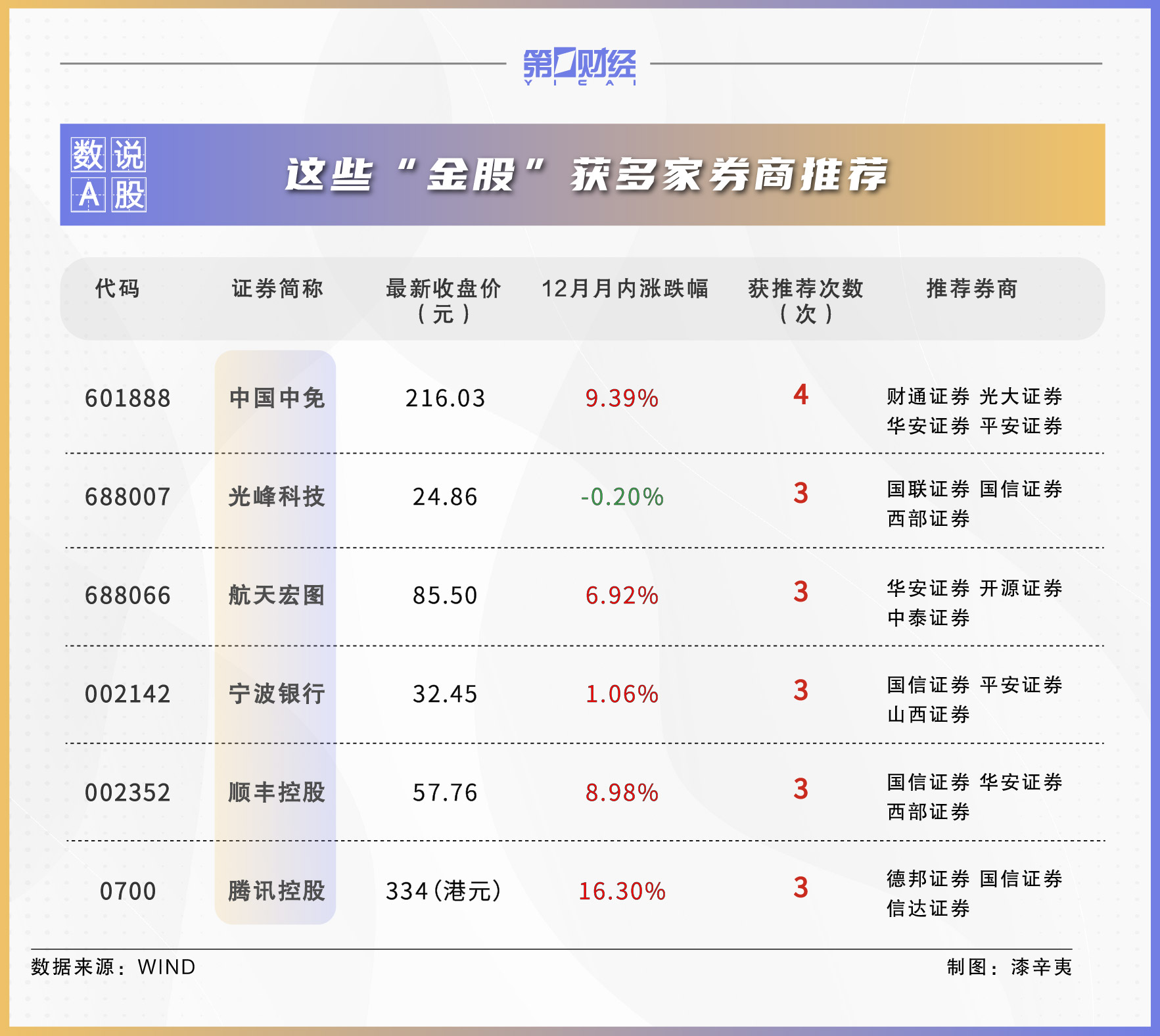 据不完全统计,在各家券商的“金股”名单中,获机构推荐次数最多的是中国中免,获得4家券商的推荐。