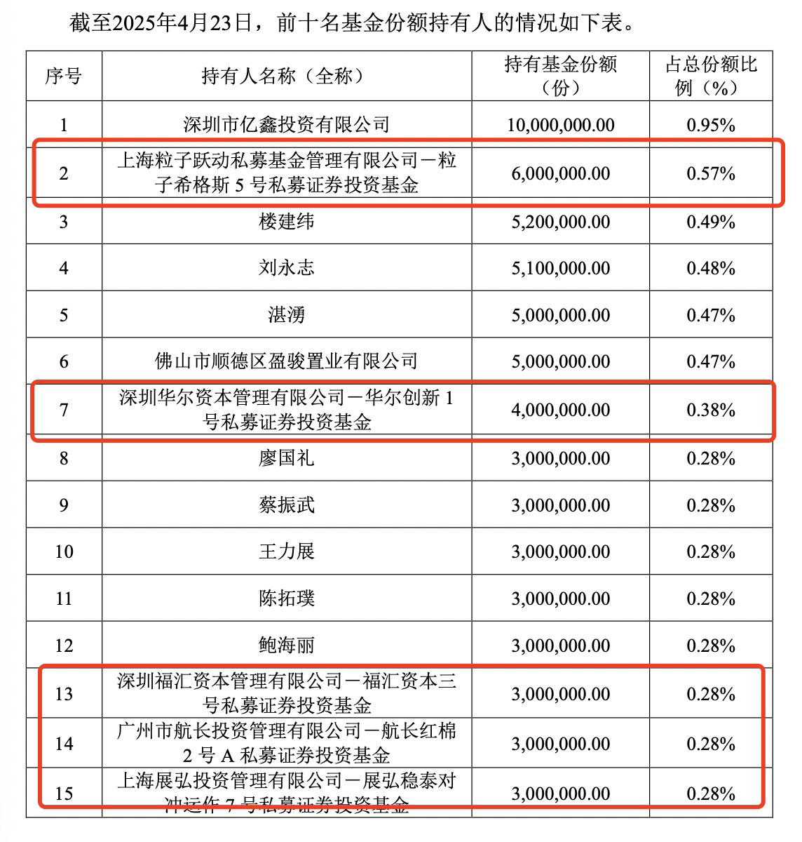 上市交易公告书显示,截至4月17日,该基金前十大持有人中包含深圳前海国丰优合资本、杭州天盈私募基金、深圳证金投资管理、青岛鹿秀投资管理、上海崇正投资管理、深圳前海千惠资产管理、上海森恩资产管理共7家私募机构旗下的产品。