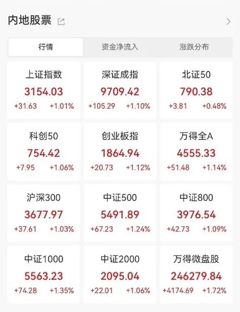 5月17日,A股市场全天低开高走。截至收盘,沪指上涨1.01%,深成指涨1.1%,创业板指涨1.12%。个股涨多跌少,沪深北三市共计4086股上涨,1125股下跌,市场成交额为8899.73亿元。