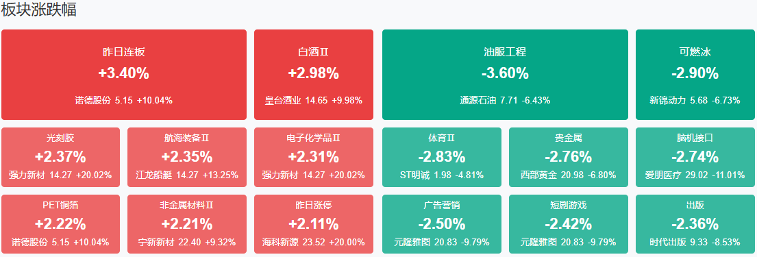 市场早盘震荡回落,三大指数涨跌不一。沪深两市半日成交额6710亿,较上个交易日缩量1167亿。盘面上热点较为杂乱,个股跌多涨少,全市场超3200只个股下跌。从板块来看,白酒股展开反弹,皇台酒业涨停。港口航运股震荡走强,宁波海运涨停。固态电池概念股一度冲高,海科新源20CM涨停。下跌方面,脑机接口概念股展开调整,爱朋医疗跌超10%。