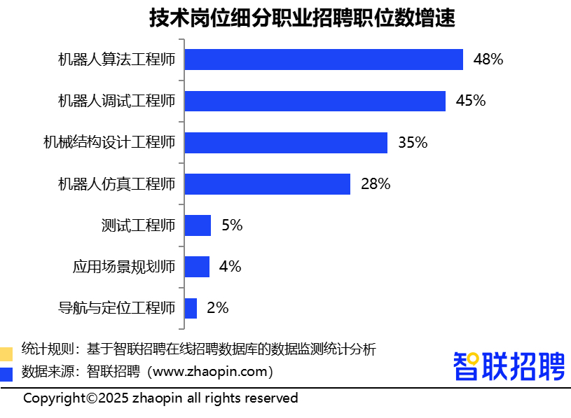更细分来看,2025年1-5月,人形机器人领域机器人算法工程师、机械结构设计工程师招聘职位数分别同比增长479%、239%,整体呈现“井喷式”增长,增速远大于整体机器人产业的相应职位。
