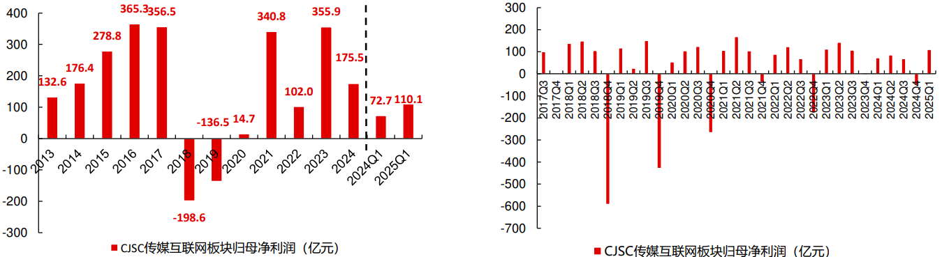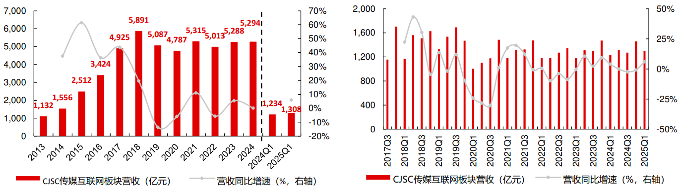 传媒行业2024年实现触底反弹,2024年营业收入较2023年同期微增,25Q1增速加快。2024年长江传媒互联网板块实现营收5294亿元,同比增长0.1%;2025Q1传媒互联网板块实现营收1308亿元,同比增长6.0%。