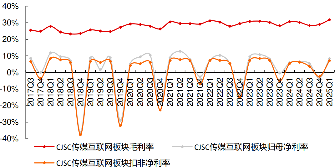 图:2024年传媒行业盈利能力有所下滑,25Q1有所修复
