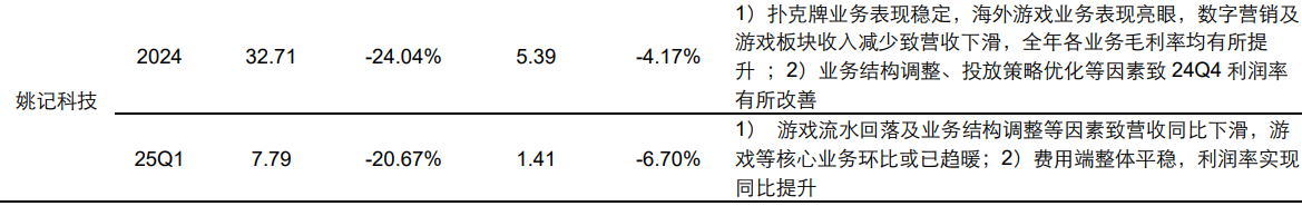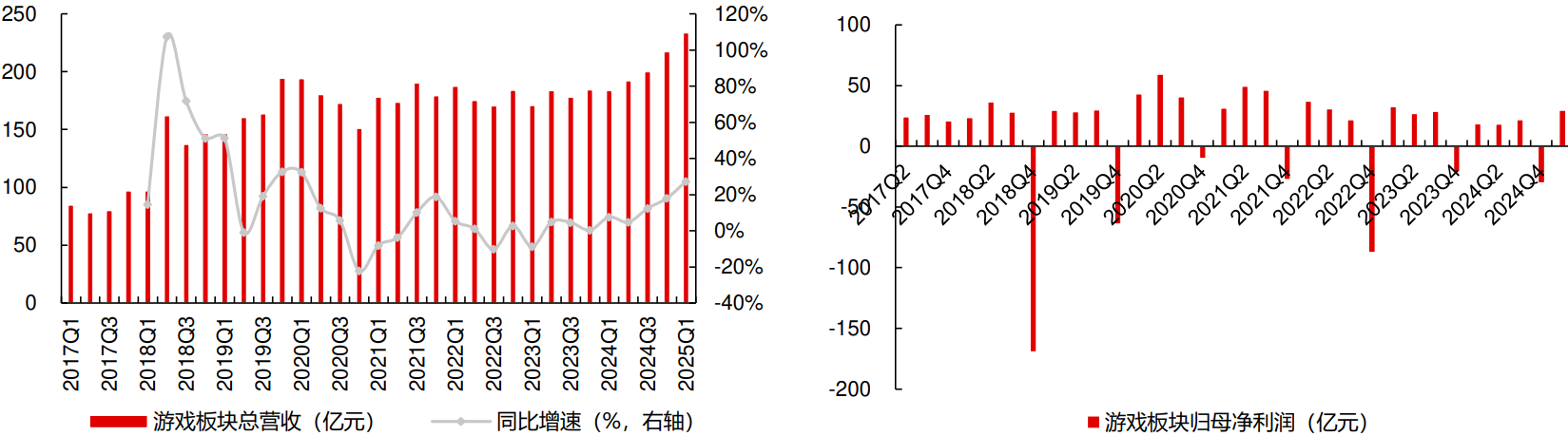 图:游戏板块营收保持稳定提升趋势 图:2024年游戏板块业绩承压,25Q1盈利显著改善
