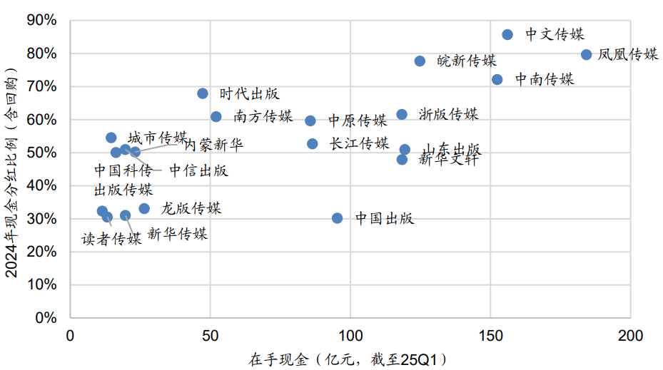 图:出版类国企的分红比例(2024年度)和在手资金(截至25Q1)