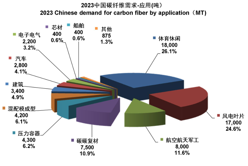 全球和中国碳纤维需求前三大应用都是风电叶片、体育休闲和航空航天军工领域。风电叶片是全球碳纤维需求最大的应用领域,占25.7%;2022年中国碳纤维需求最大的领域为体育休闲,占30.90%;风电叶片位列第二,占23.5%。