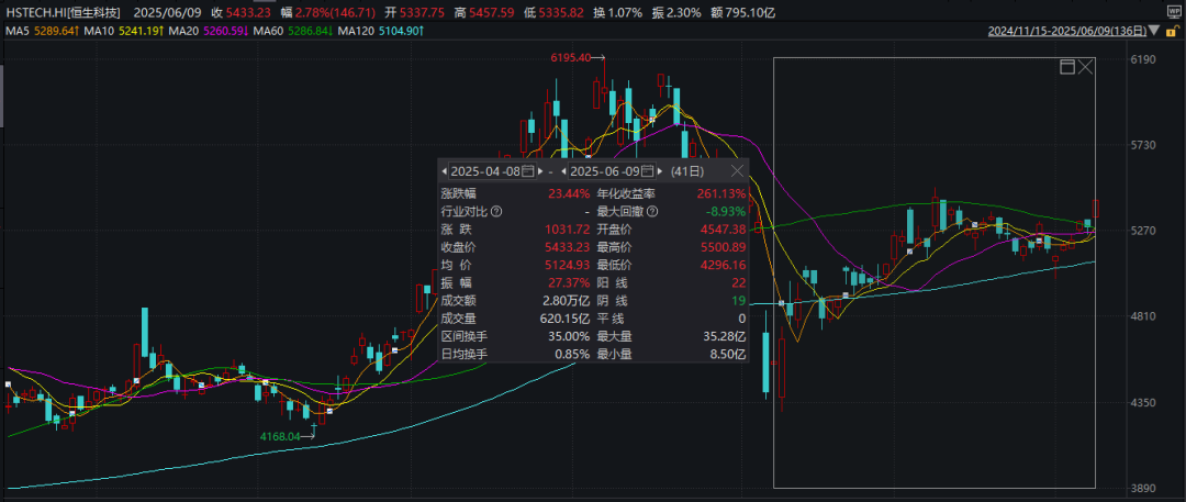 港股方面,截至收盘,恒生指数涨1.63%,恒生科技指数涨2.78%。值得注意的是,恒生科技指数自4月8日以来累计涨幅超过20%,迈入技术性牛市。个股方面,金蝶国际涨约12%,腾讯音乐、快手涨超5%,美团、京东集团涨超4%,泡泡玛特涨超2%,续创历史新高。