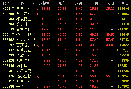 医药板块盘中大幅拉升,截至收盘,星昊医药涨超27%,盘中创出新高;常山药业20%涨停亦创出新高,海辰药业、舒泰神、睿智医药等均20%涨停。
