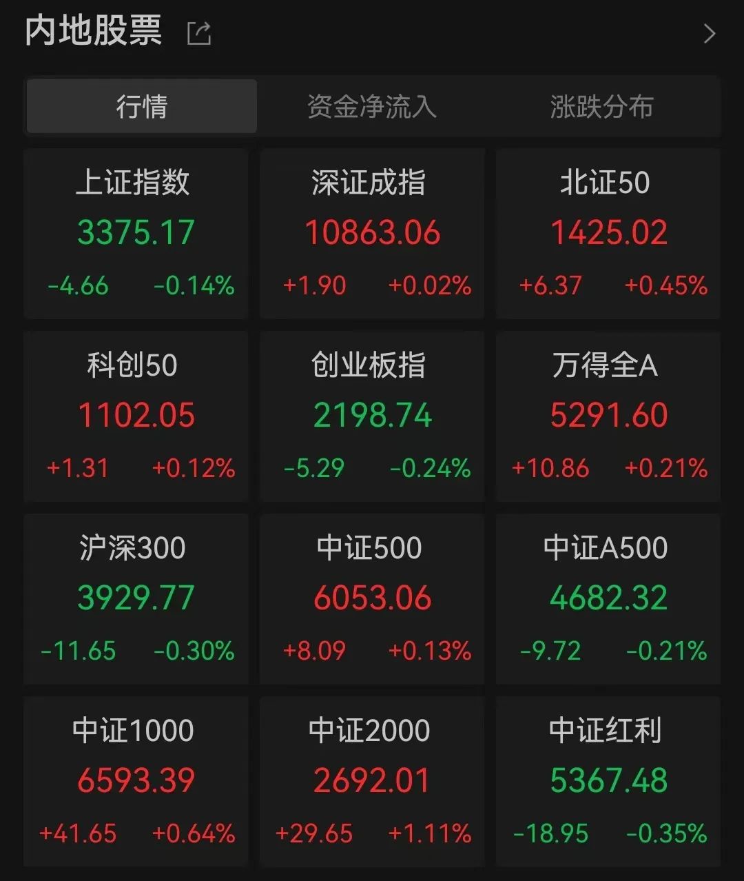 A股市场今天上午整体涨跌不一。截至中午收盘,上证指数跌0.14%,深证成指涨0.02%,创业板指跌0.24%,科创50指数涨0.12%,北证50指数涨0.45%。