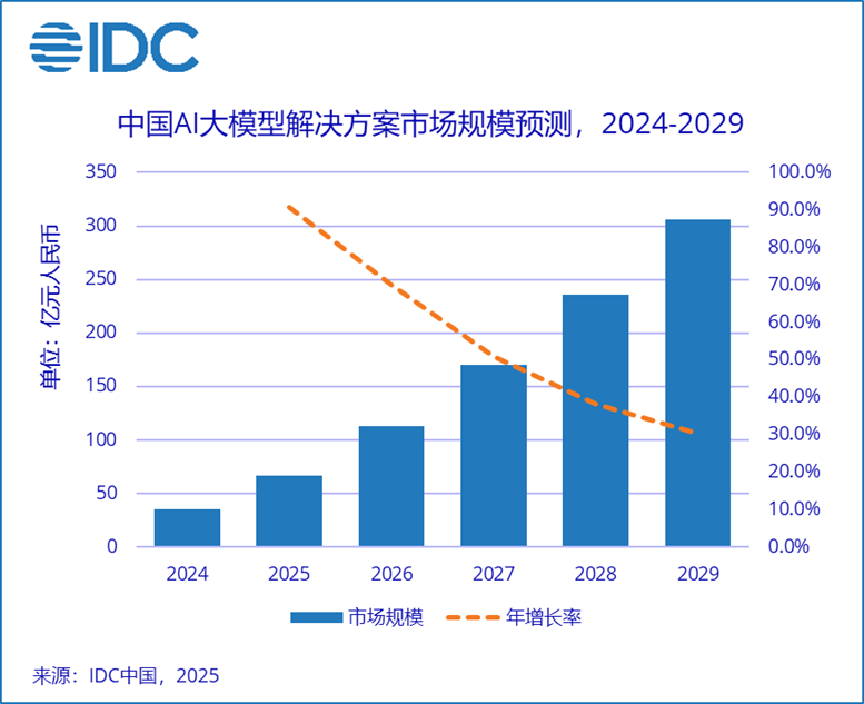 国际数据公司 (IDC)最新发布的《中国模型即服务(MaaS)及AI大模型解决方案市场追踪,2024H2》报告显示,2024 年中国 MaaS市场呈现爆发式增长,全年规模达 7.1 亿元人民币,较 2023 年实现215.7% 的同比激增,其中 2024 下半年市场规模达4.6亿元人民币。 展望 2024-2029 年,该市场将以 66.1% 的年均复合增长率高速扩容,预计2029 年市场规模将达到 90 亿元人民币。AI 大模型解决方案市场同样保持高位增长态势。2024 年全年市场规模达 34.9 亿元人民币,同比增长 126.4%,其中2024下半年市场规模达为21.0 亿元人民币。未来五年,该市场将以 54.5% 的年均复合增长率持续扩张,预计 2029 年整体规模达 306 亿元人民币。