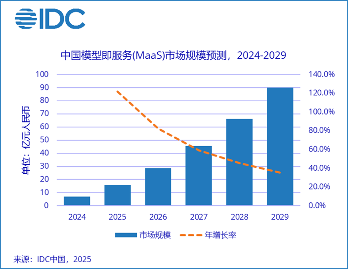 IDC 预计,2025 年,中国模型即服务(MaaS)市场将延续超 100% 的高速增长态势。企业数字化转型持续深化,降本增效的迫切需求日益凸显,而 MaaS 模式凭借便捷接入、低成本投入、开箱即用的特性与灵活扩展能力,通过一站式模型服务精准匹配企业核心诉求,成为市场增长的底层驱动力。DeepSeek 在 2025 年的强势崛起为市场注入关键动能:其技术创新优化了模型训练和推理成本以及性能表现,开源策略进一步降低使用壁垒,并带动大模型生态扩张,进一步激发企业对 MaaS 服务的需求。在需求端刚需与供给端技术创新的双重驱动下,MaaS 市场规模快速扩张,并加速向高性能、低成本、多芯片集群方向演进。