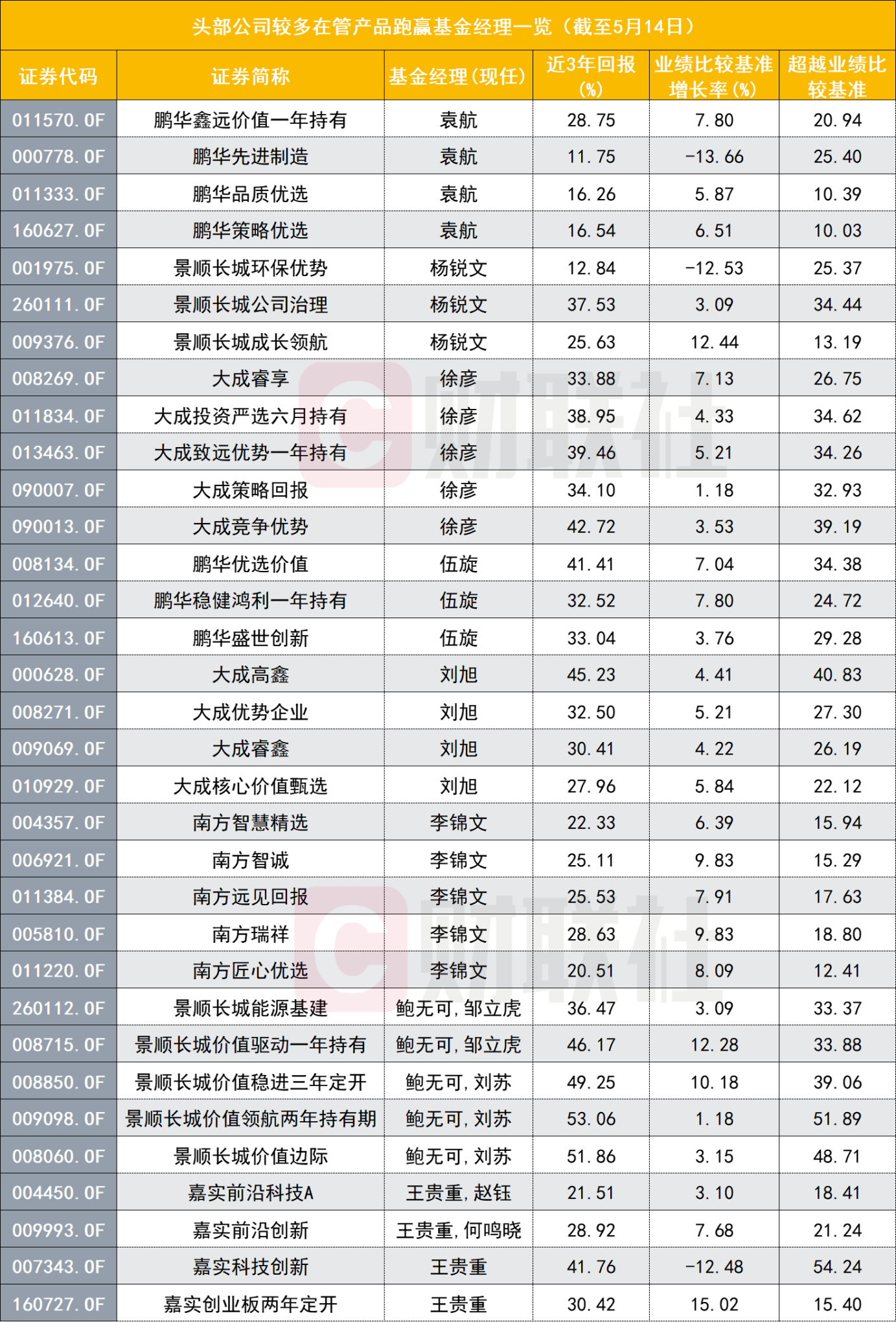 基于上述情况,记者也尝试梳理现存公募基金中,现任基金经理任职时间满3年、近三年业绩回报跑赢业绩比较基准、跑赢业绩比较基准超10%的主动权益基金,寻找出各家基金公司的“种子选手”。