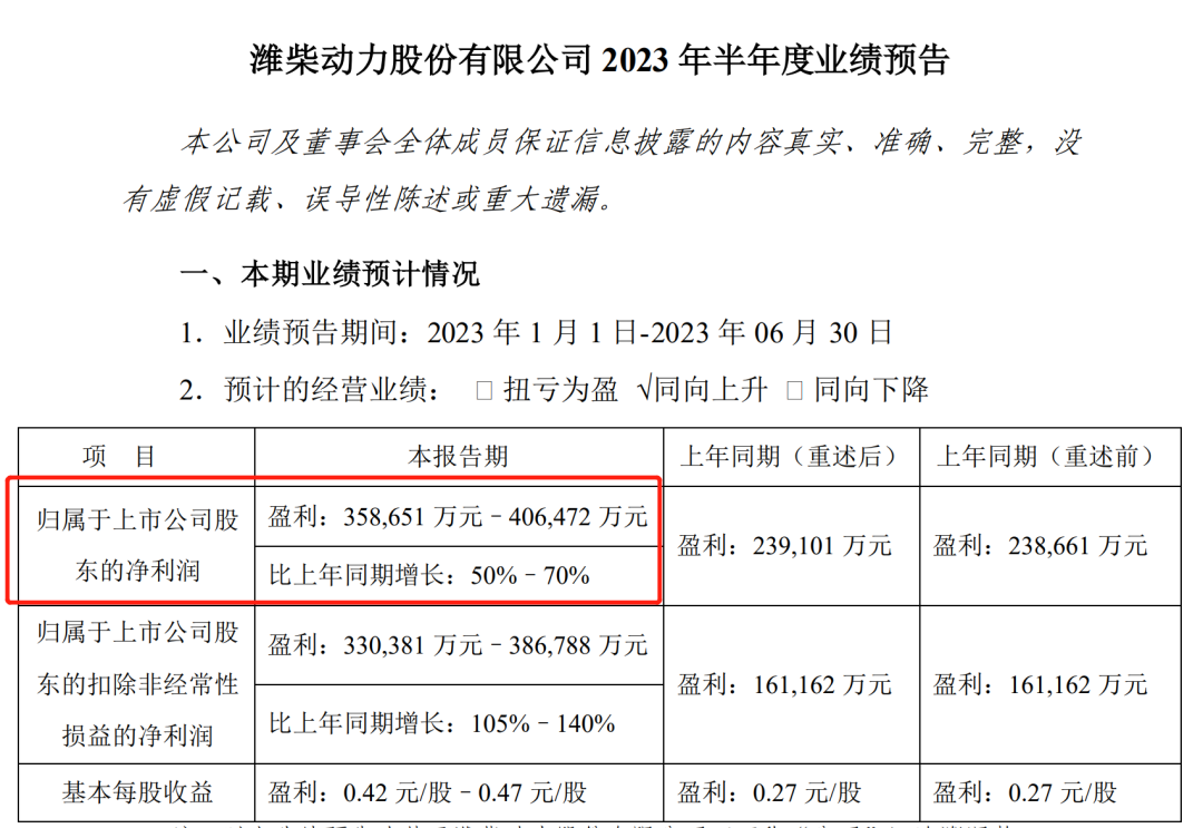 潍柴动力的2023年半年度业绩预告显示,公司净利润预计为35.87亿元–40.65亿元,预计同比增长50%–70%。