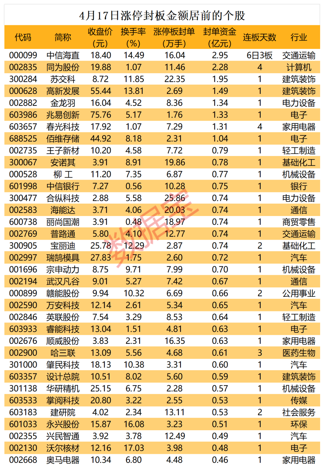 以封单金额计算,8股封单金额超亿元,低空经济龙头中信海直封单资金2.95亿元,另外,同为股份、苏交科封单金额分别为2.28亿元、1.95亿元。