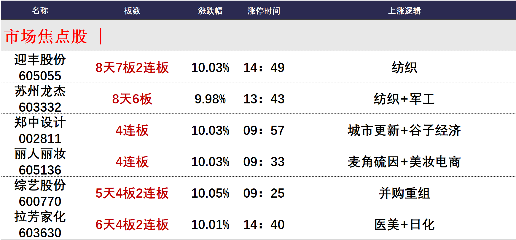板块方面,以谷子经济、宠物经济、医美为代表的新消费板块全天表现强势,其中郑中设计、丽人丽妆4连板,拉芳家化6天4板,天元宠物20CM2连板;并购重组概念依旧受到热捧,综艺股份5天4板,天汽模3连板,北交所五新隧装30CM2连板。