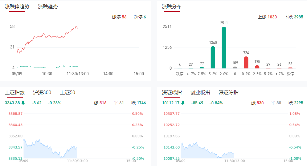 市场早盘震荡调整,创业板指领跌。沪深两市半日成交额7880亿,较上个交易日缩量216亿。盘面上热点较为杂乱,个股涨多跌少,全市场超4100只个股下跌。从板块来看,银行股逆势走强,建设银行、江苏银行等再创历史新高。纺织概念股集体大涨,万事利等涨停。电力股再度走高,淮河能源涨停。下跌方面,芯片股展开调整,华虹公司跌超10%。